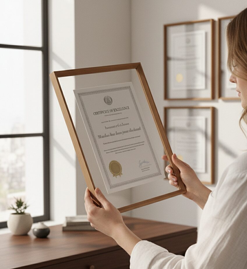 Transformamos seus diplomas, certificados e prêmios em peças de destaque e inspiração.
